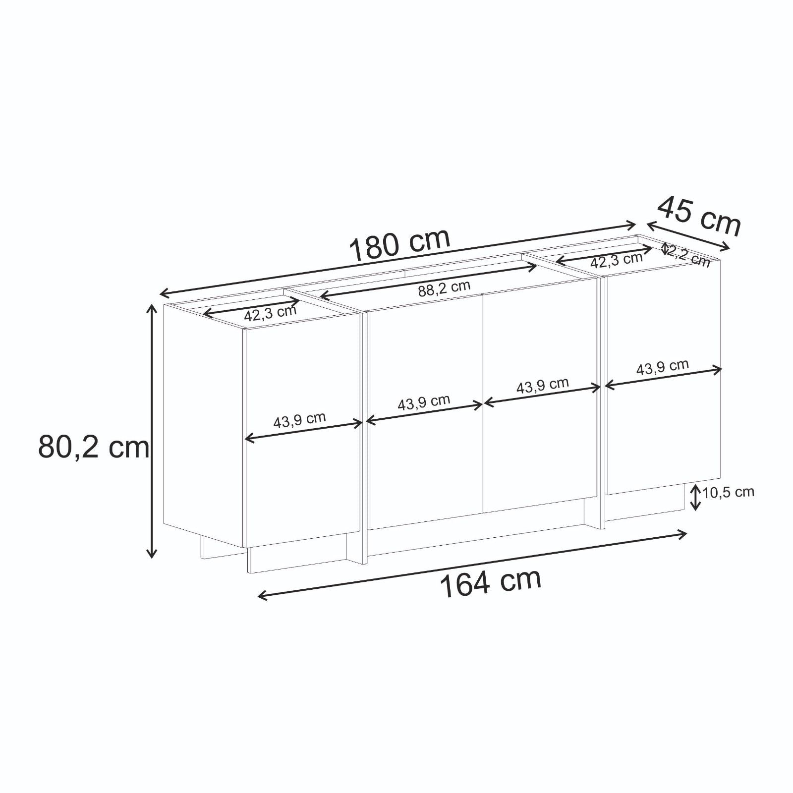 Med en bredd på 180 cm, höjd på 80 cm och djup på 45 cm, är denna konsol den perfekta tillägget till vilket modernt hem som helst. Den 18 mm tjocka spånskivan säkerställer stabilitet och lång livslängd, medan benhöjden på 10 cm ger en touch av elegans till den övergripande designen.
