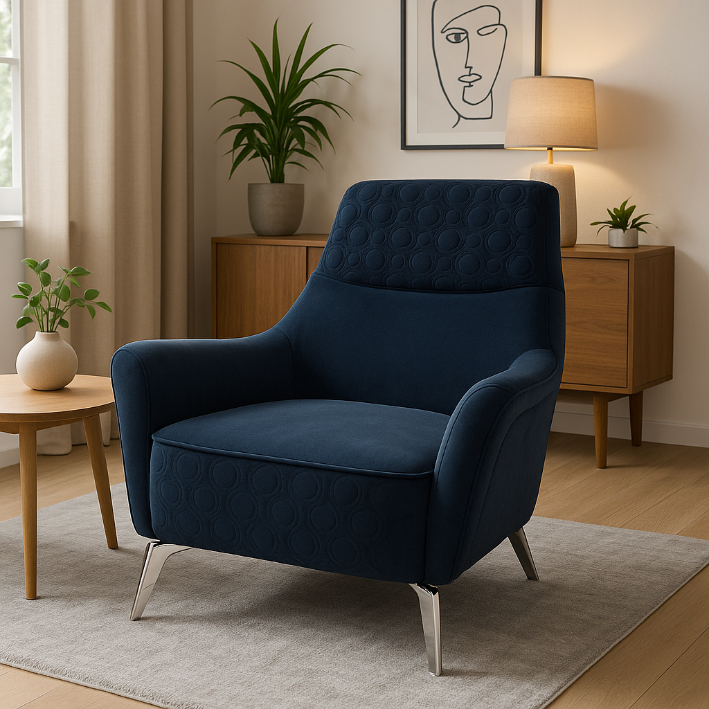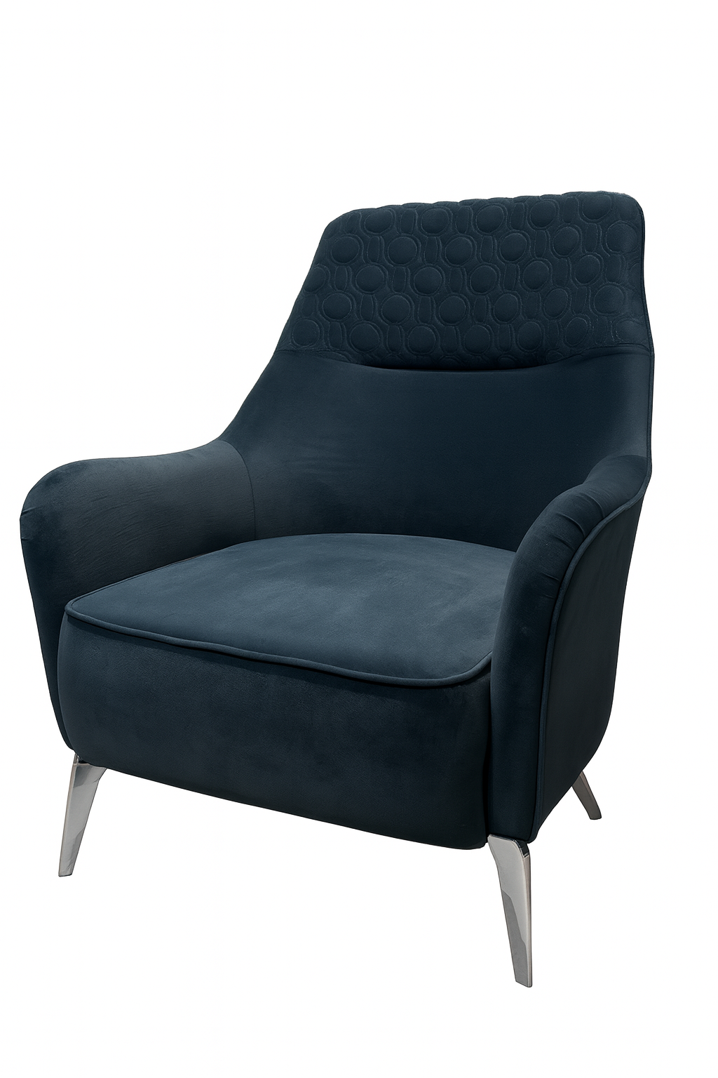 Stilren och modern fåtölj i mörkblå sammet med eleganta metallben som ger ett exklusivt uttryck. Den mjuka stoppningen och den ergonomiska designen erbjuder hög komfort, perfekt för avkoppling i vardagsrum eller lounge. Det unika quiltade mönstret på ryggstödet ger fåtöljen en sofistikerad och tidlös känsla, idealisk för skandinavisk inredning och moderna hem.