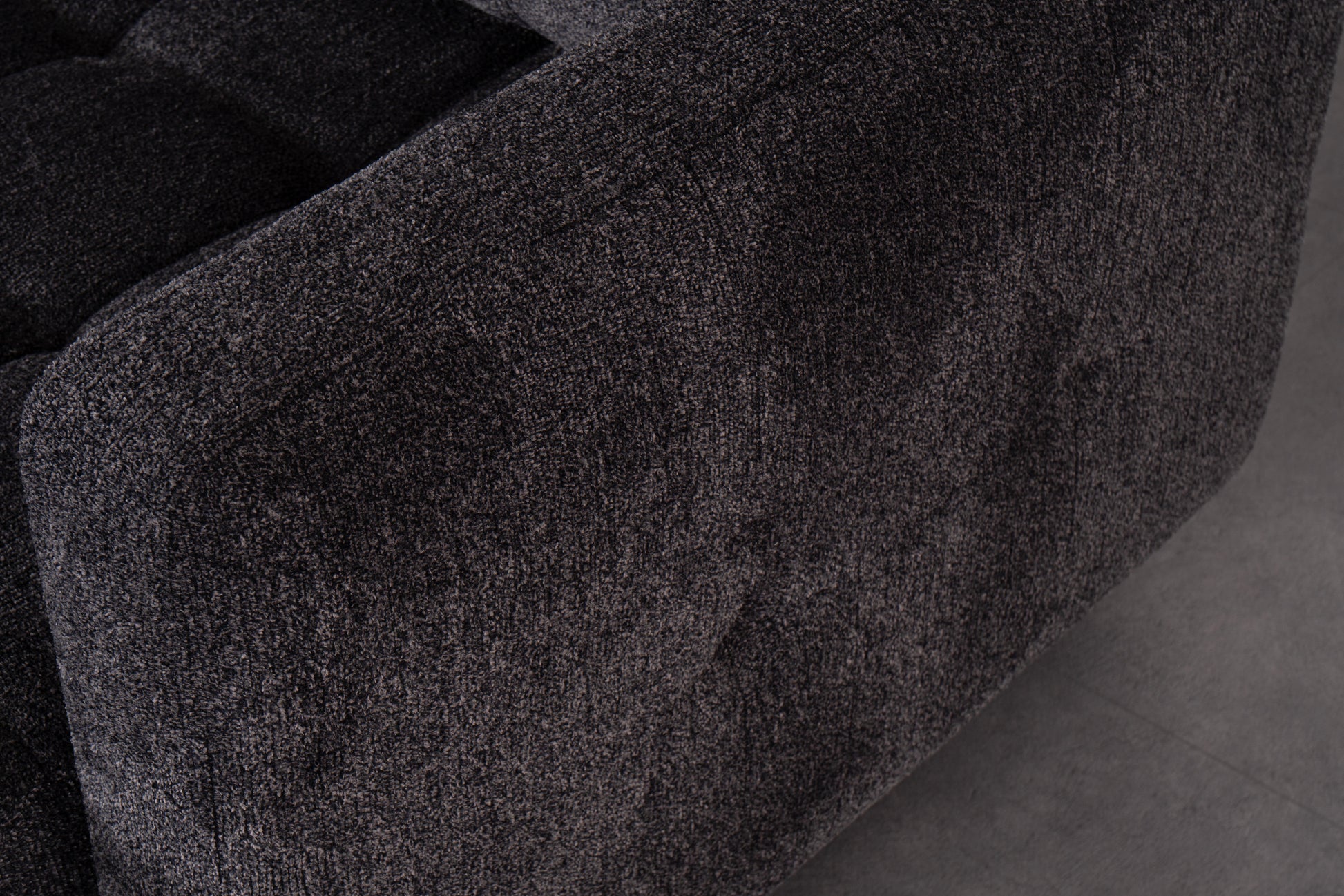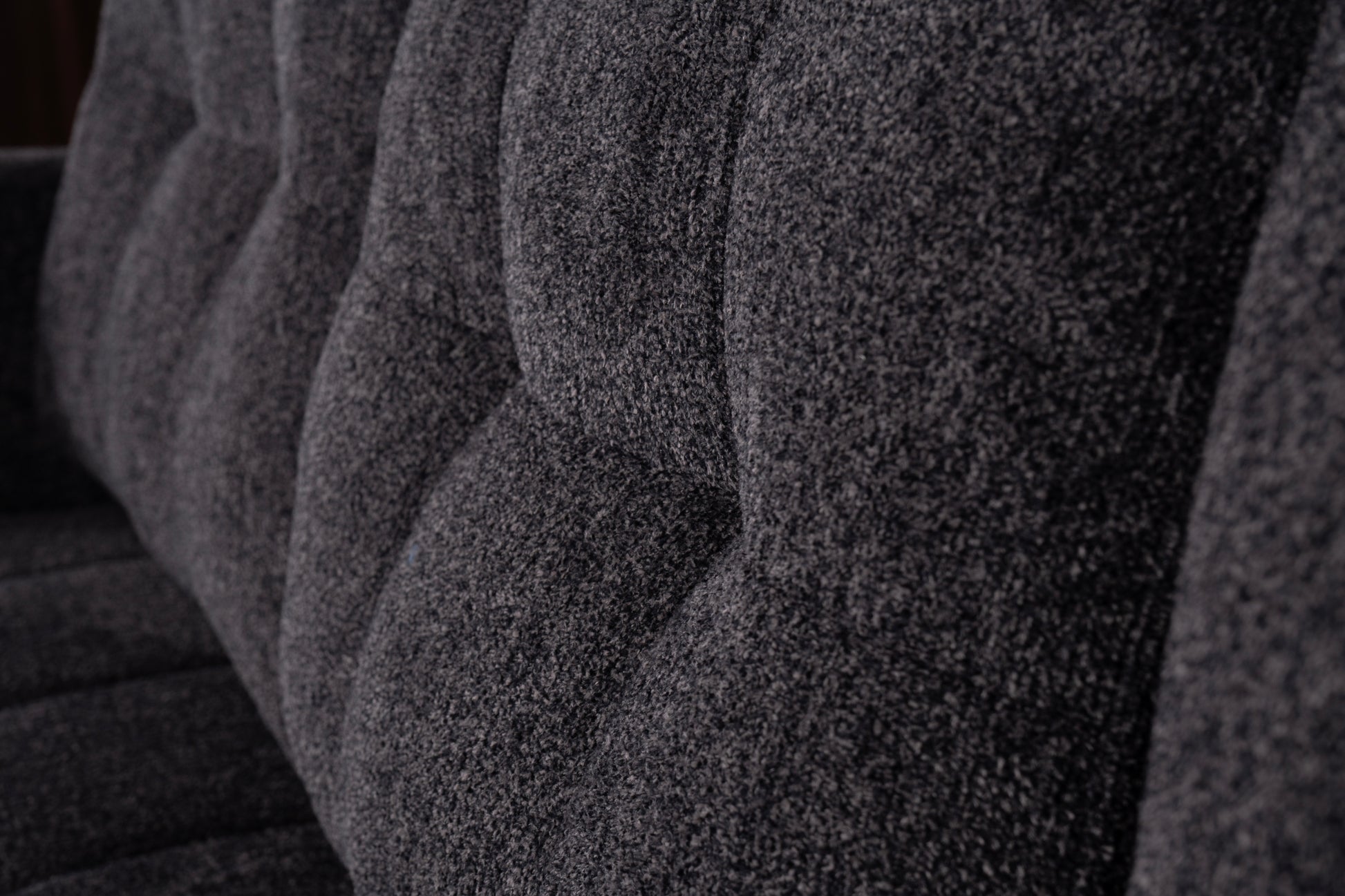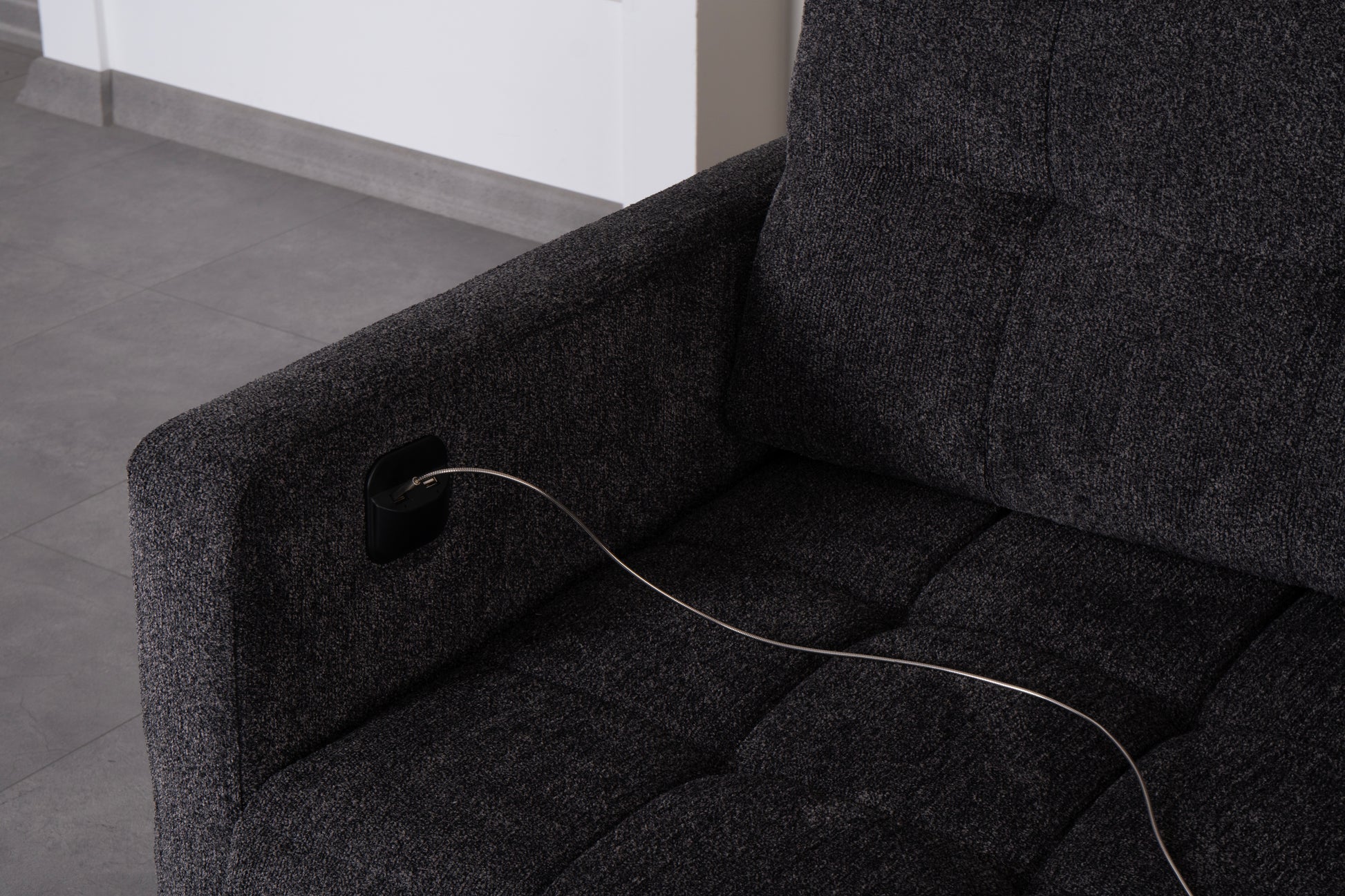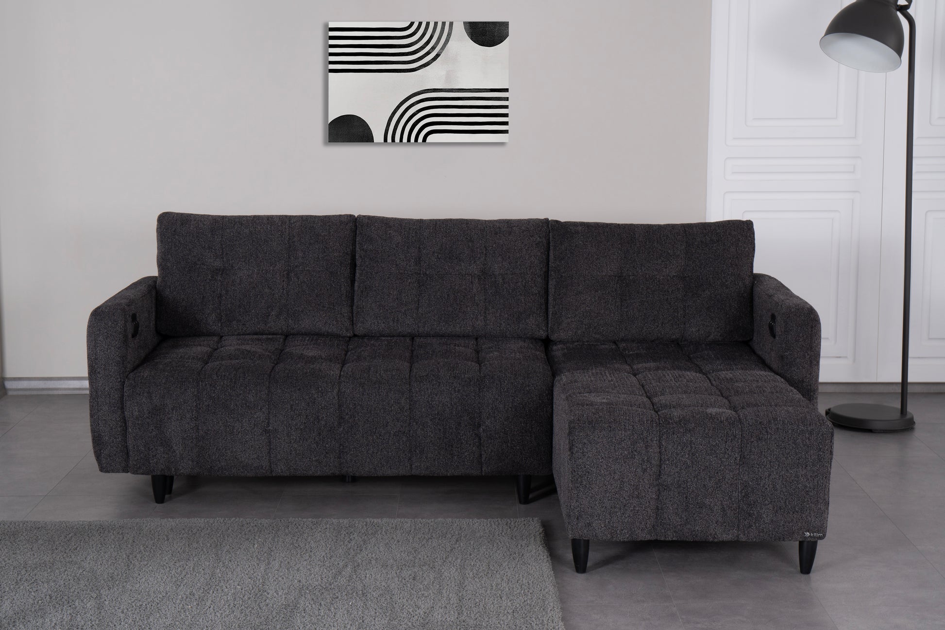 Det slitstarka mörkgrå tyget ger ett sobert och tidlöst intryck, medan de mjukt vadderade sittdynorna och ryggstöden erbjuder hög sittkomfort. Den integrerade schäslongen ger extra utrymme för avslappning, och den stabila träramen garanterar lång hållbarhet.