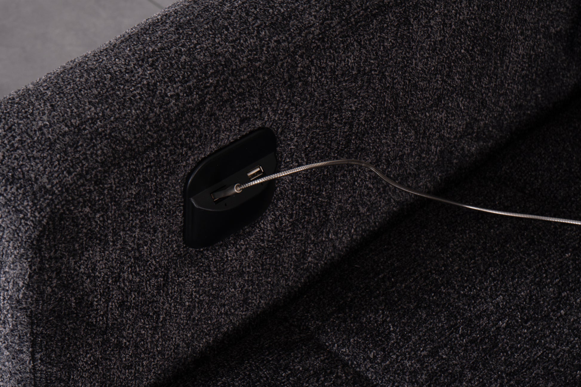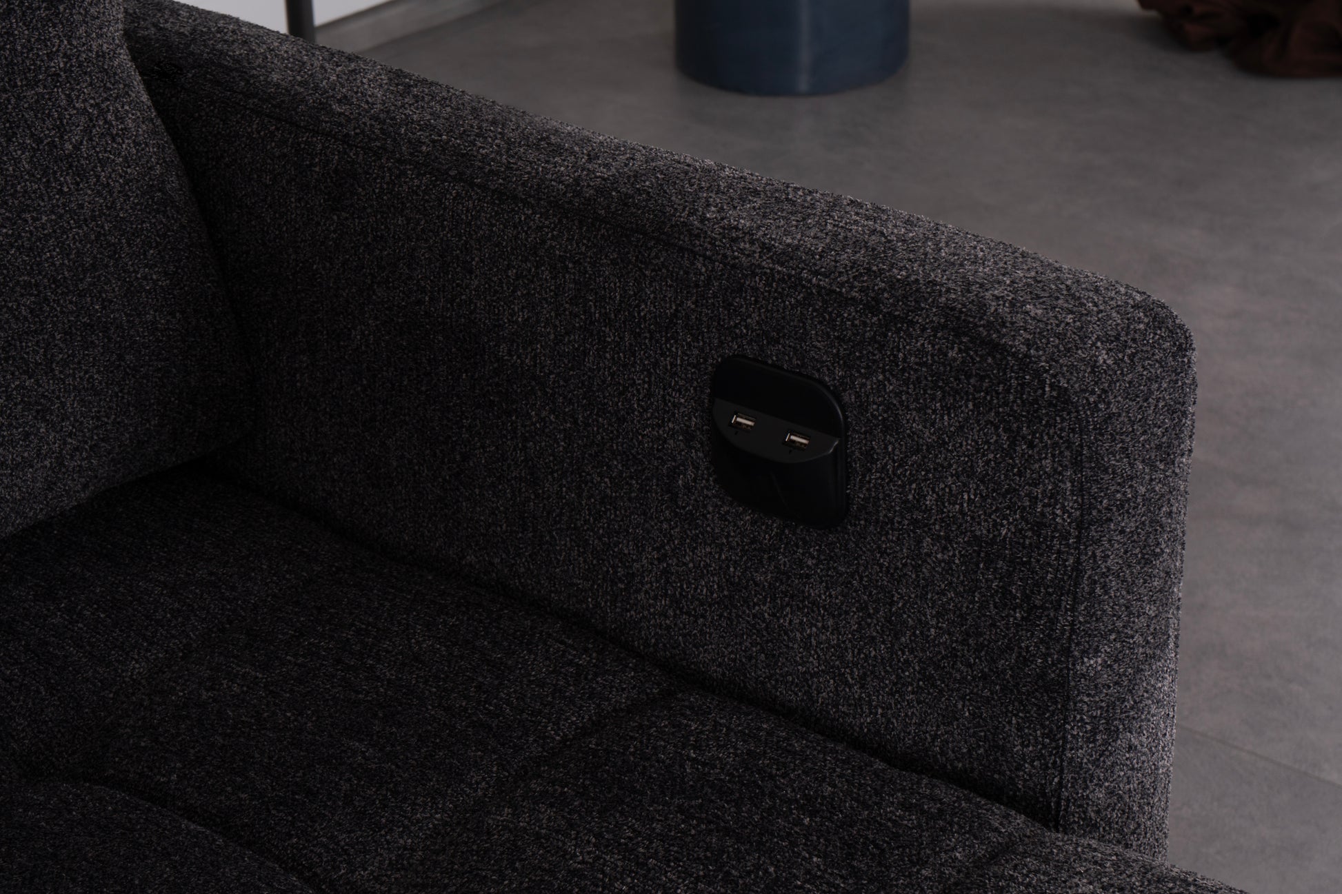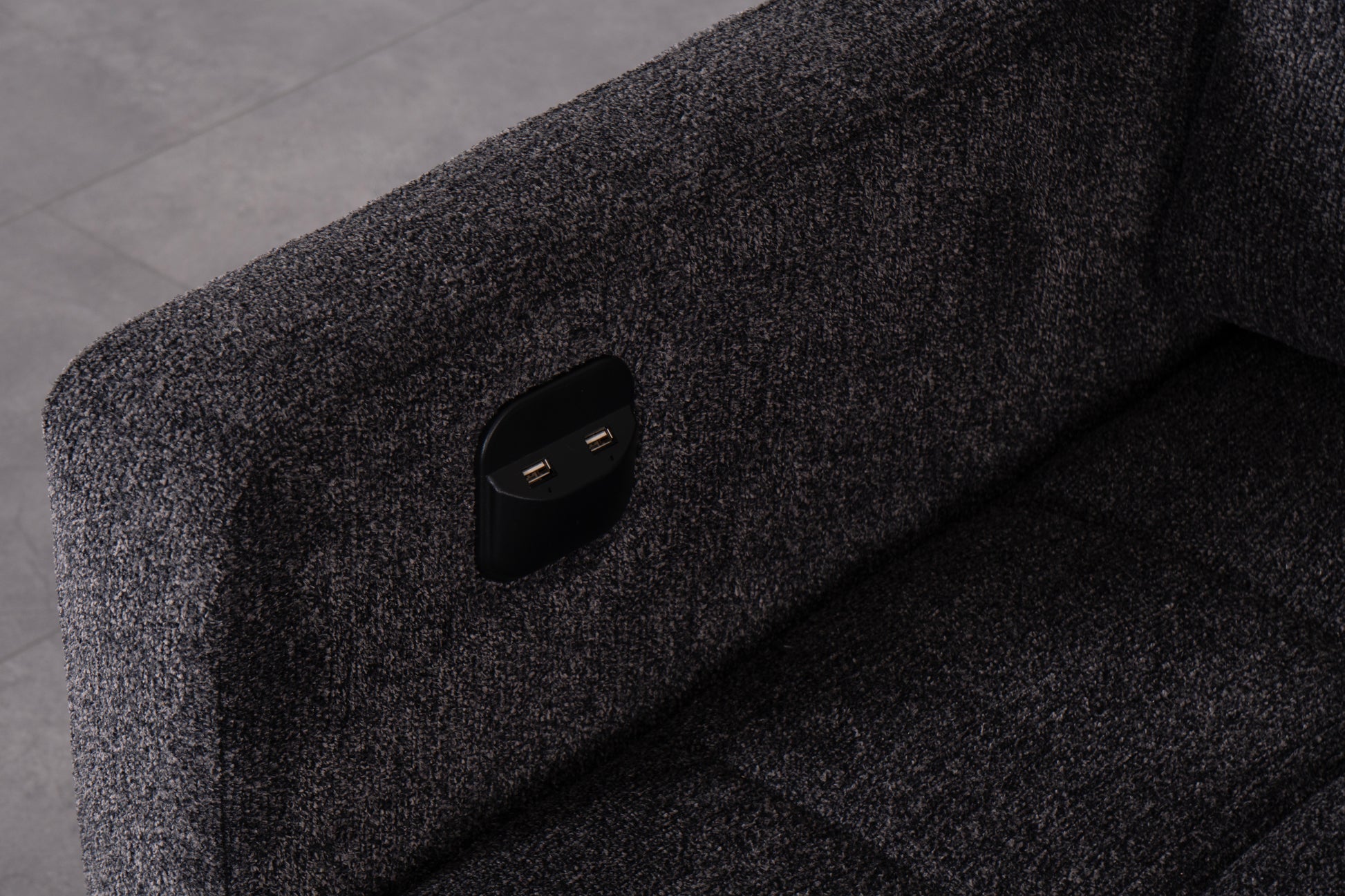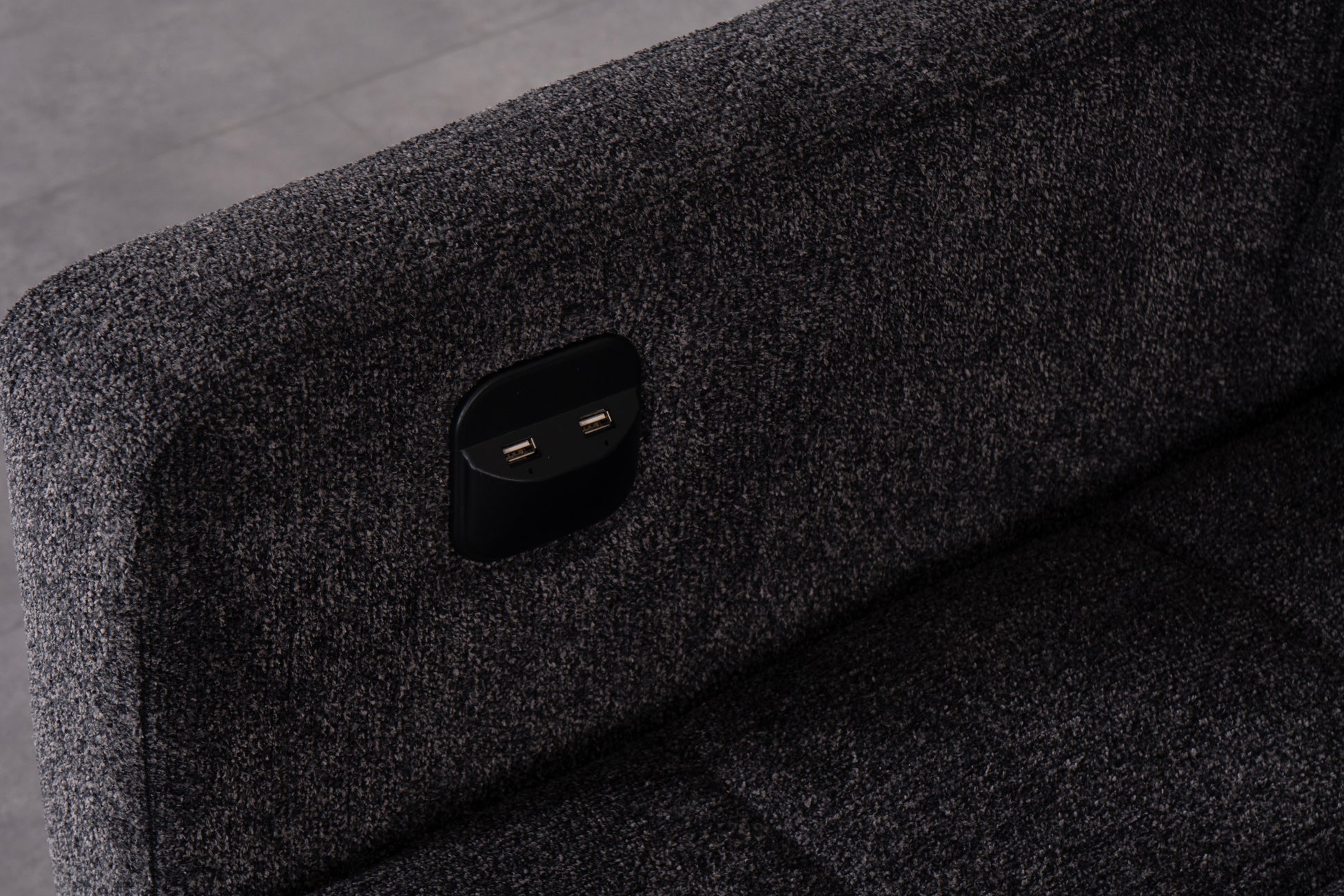 Det slitstarka mörkgrå tyget ger ett sobert och tidlöst intryck, medan de mjukt vadderade sittdynorna och ryggstöden erbjuder hög sittkomfort. Den integrerade schäslongen ger extra utrymme för avslappning, och den stabila träramen garanterar lång hållbarhet.