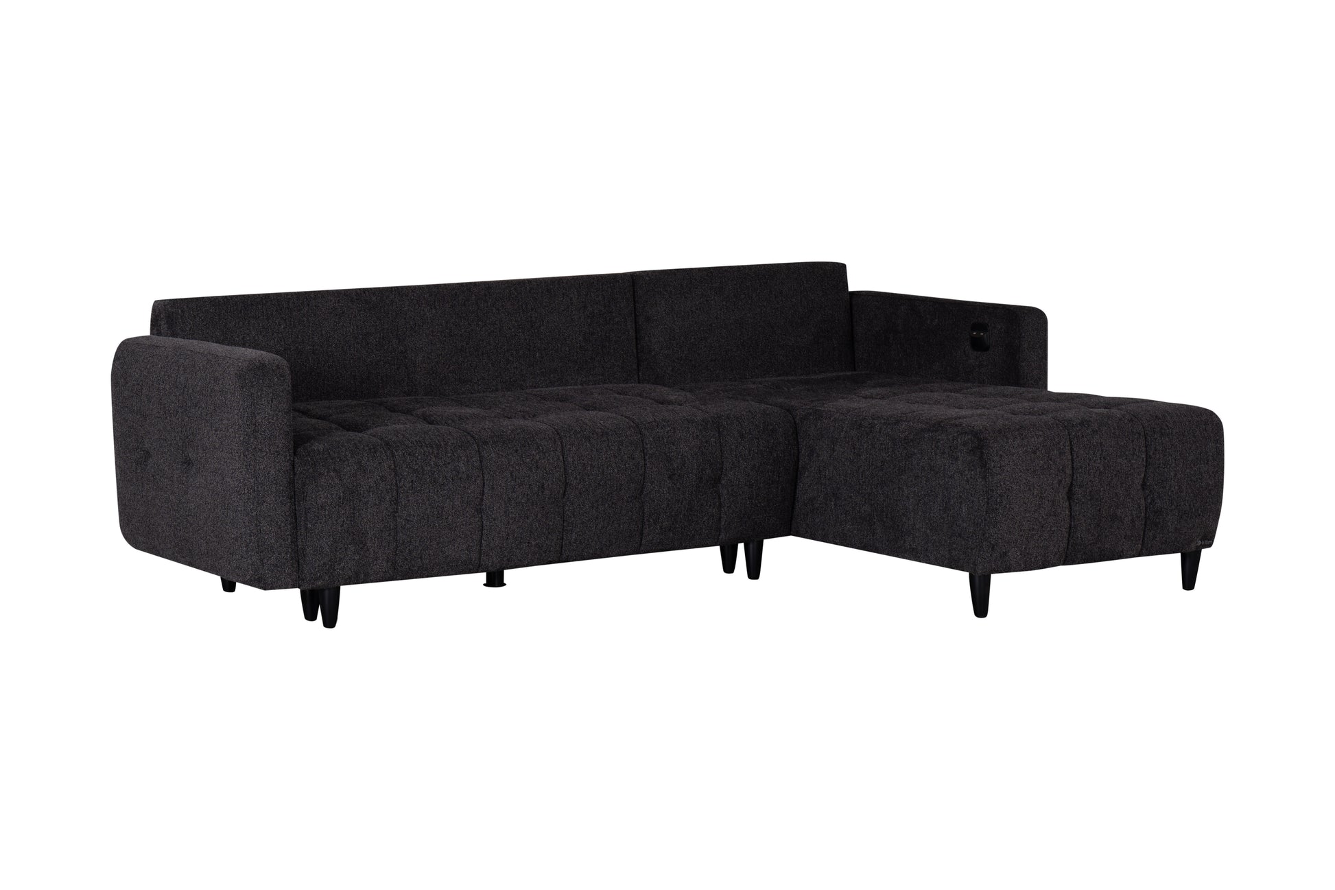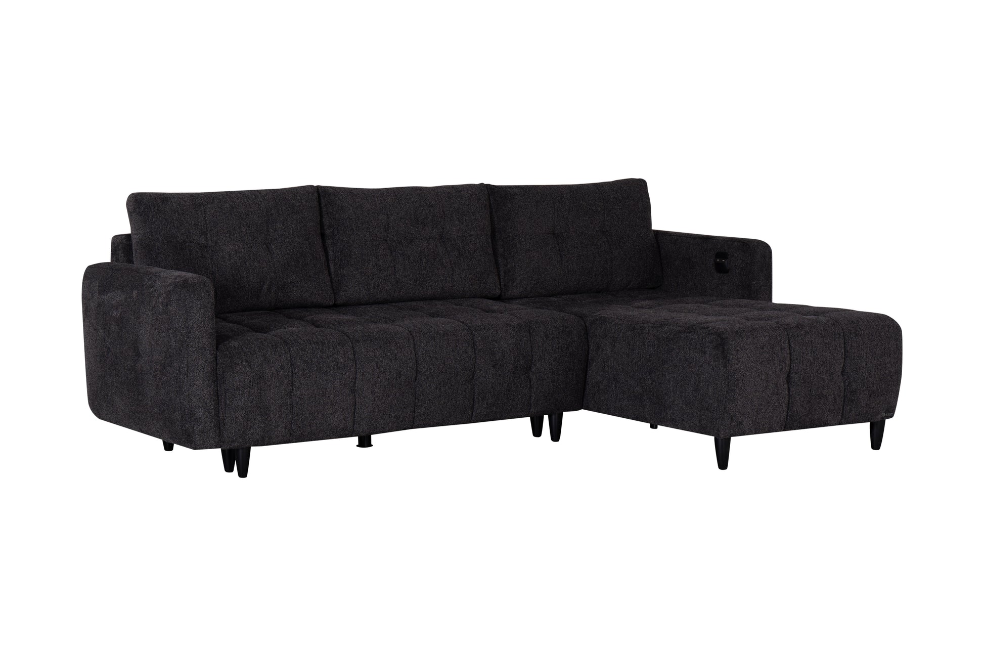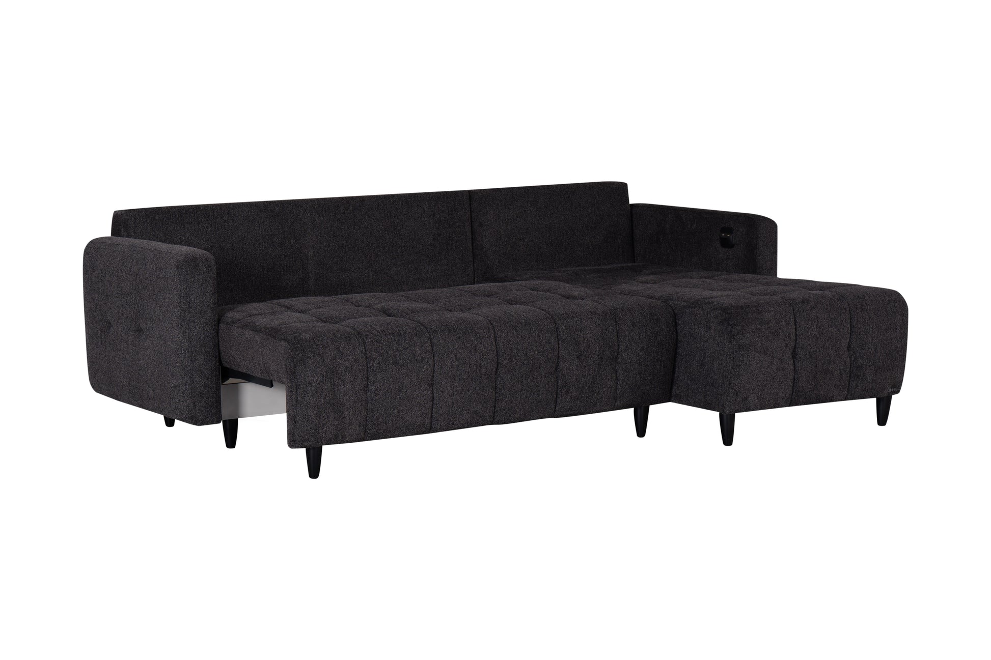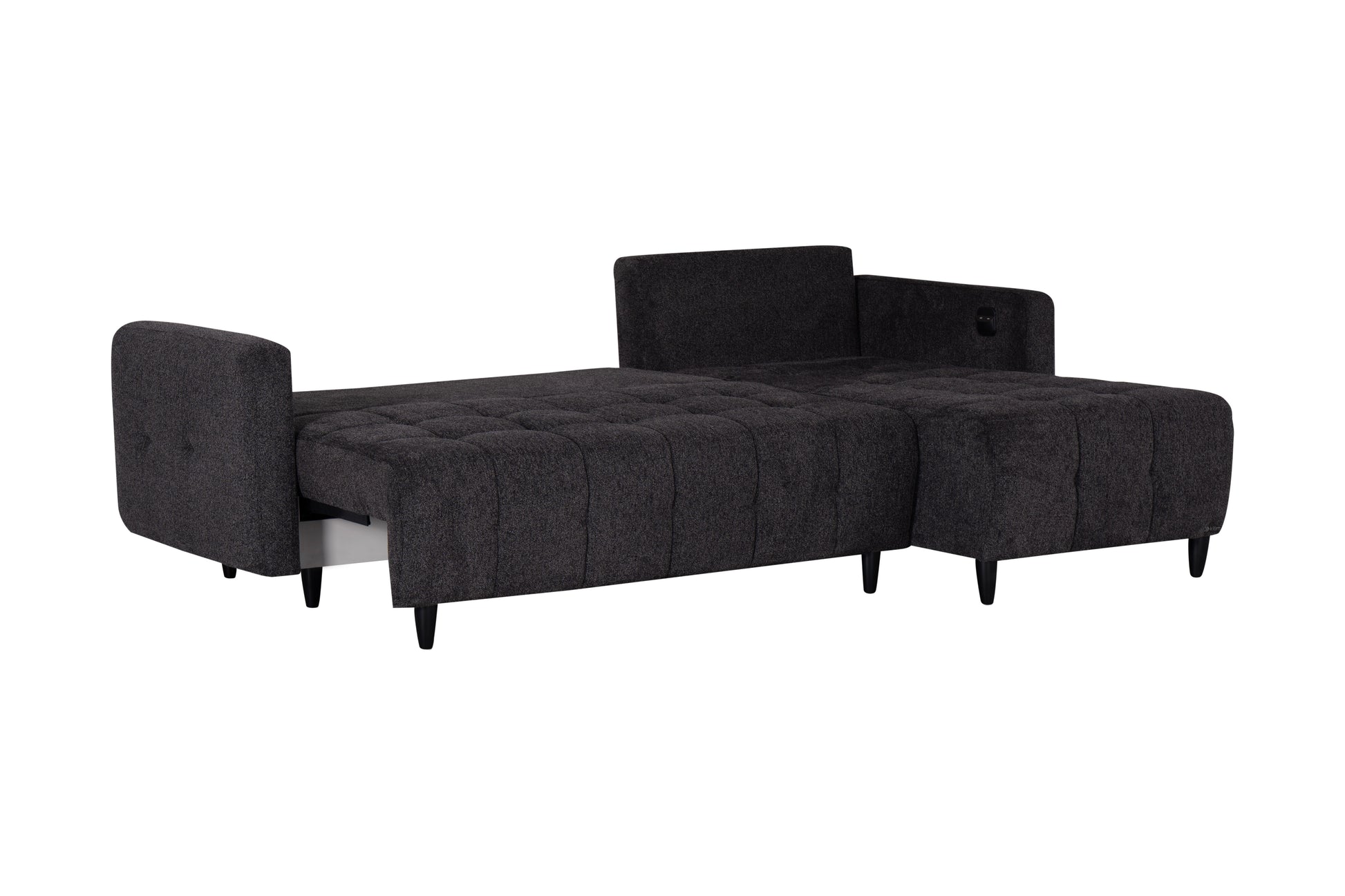 Ge ditt vardagsrum en elegant och praktisk uppgradering med denna moderna hörnbäddsoffa i mörkgrå färg. Soffan kombinerar stilren design med smart funktionalitet – perfekt för dig som vill ha både komfort och extra sovplats. Med ett enkelt handgrepp förvandlas soffan till en rymlig säng, idealisk för gäster eller spontana övernattningar.