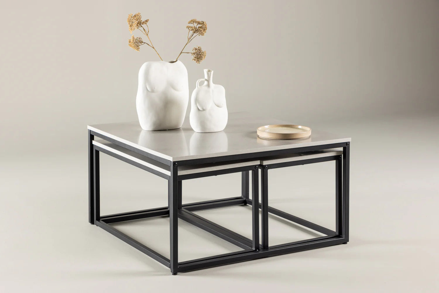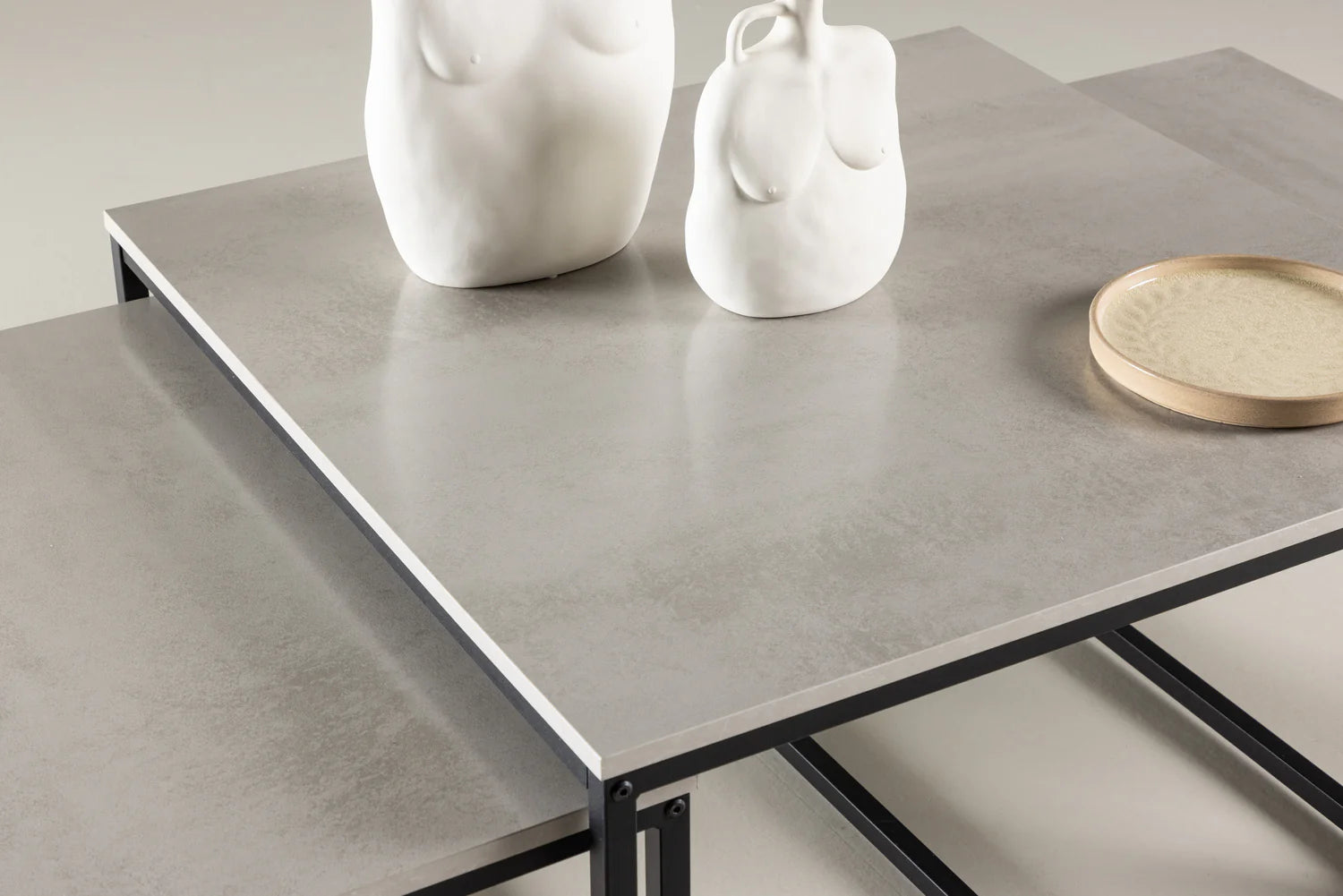 Bordsskivorna är tillverkade i grå MDF och vilar på ben av svart pulverlackerat stål, vilket skapar en snygg kontrast och en modern känsla. Den genomtänkta designen passar både små och stora vardagsrum och kombinerar praktisk funktion med skandinavisk elegans.
