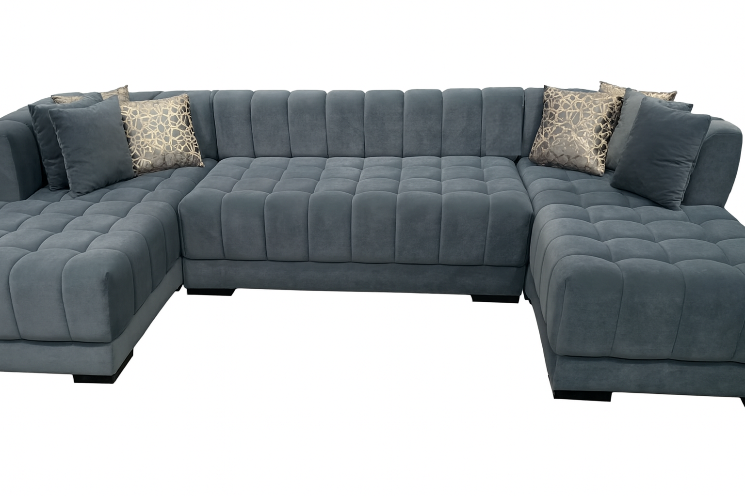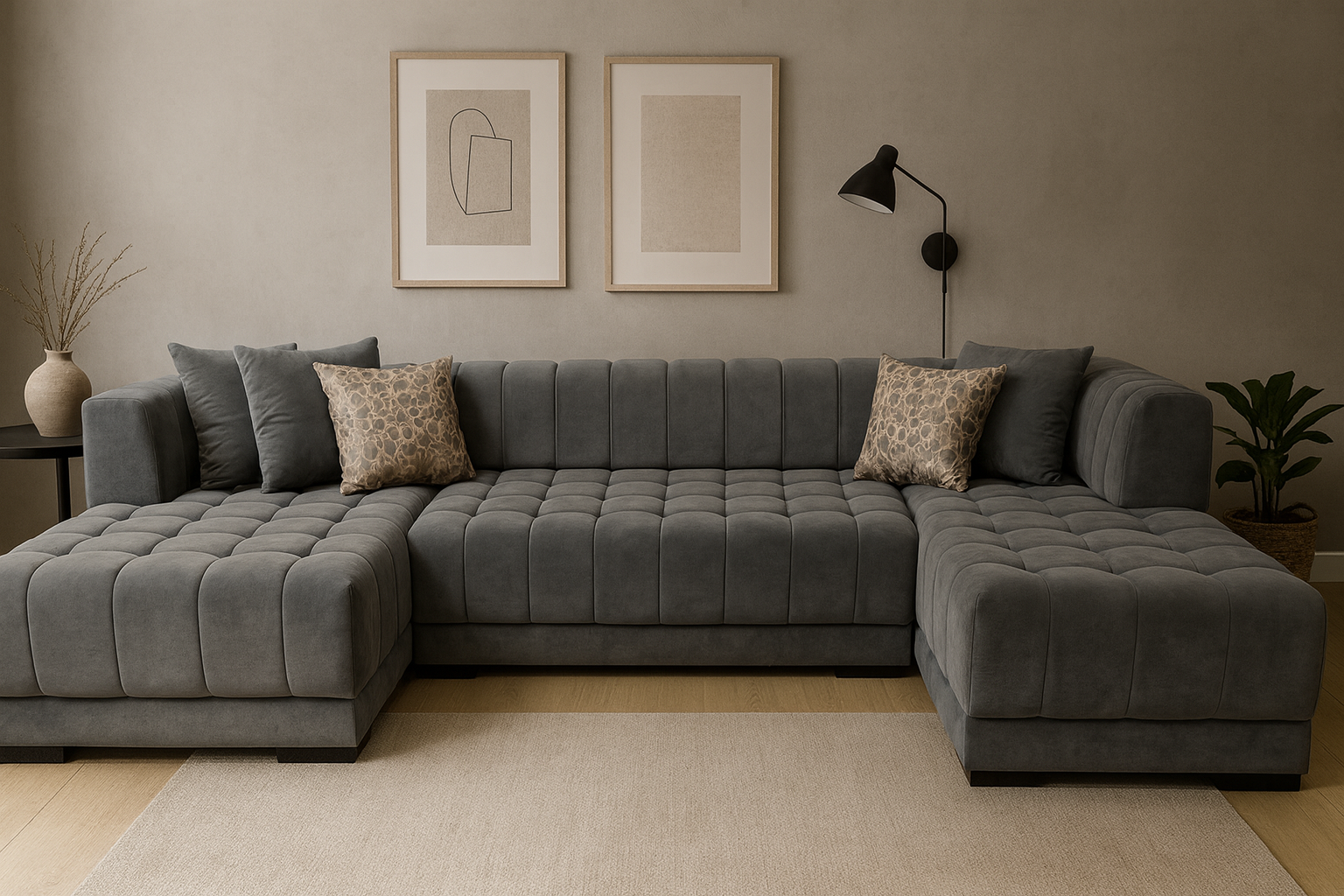 Modern hörnsoffa i elegant grå färg med stilren, ribbad tygklädsel i slitstark polyester. Soffan har två öppna divaner, en på vardera sida, vilket skapar gott om plats för avkoppling och sociala stunder. Perfekt för vardagsrum eller lounge tack vare sin tidlösa design och bekväma sittkomfort. Levereras med dekorativa kuddar som fulländar den moderna och inbjudande looken.