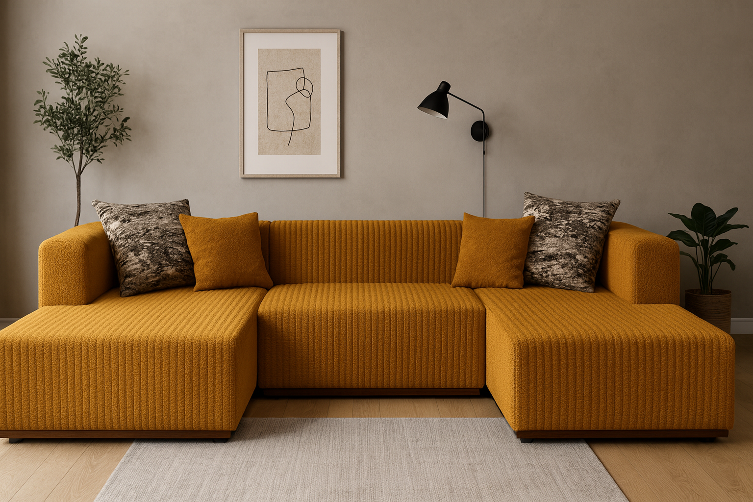 Modern hörnsoffa i varm senapsgul färg med stilren, ribbad tygklädsel i slitstark polyester. Soffan har två öppna divaner, en på vardera sida, vilket ger gott om plats för avslappning och sociala stunder. Perfekt för vardagsrum eller lounge med sin trendiga design och bekväma sittkomfort. Levereras med dekorativa kuddar som kompletterar den moderna looken.