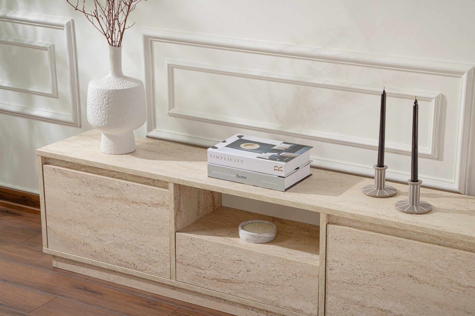 Denna TV-bänk är enkel att montera, så att du snabbt kan njuta av dess skönhet och funktionalitet. Travertin-färgen tillför en touch av värme och elegans till vilket rum som helst, vilket gör den till det perfekta tillskottet till din heminredning.